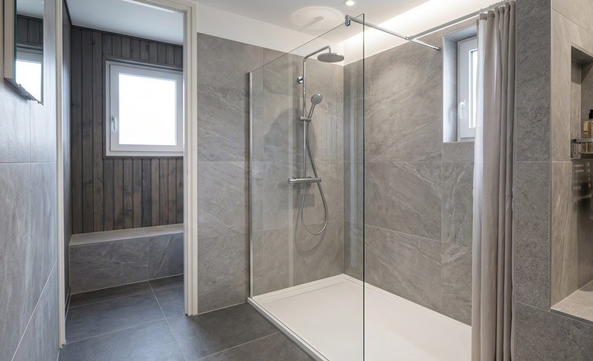 Nous procédons à la dépose de la baignoire existante puis à l’encastrement d’un receveur extra-plat, permettant un accès sans marche. Les murs sont habillés de panneaux de construction en polystyrène extrudé (type Wedi), particulièrement résistants à l’eau. Une natte d’étanchéité est appliquée sur les surfaces, complétée par des bandes d’armature d’angle pour une parfaite continuité. Pour l’évacuation, un siphon à grand débit évite toute stagnation. L’ensemble est carrelé et jointé à l’aide d’un joint époxy, garantissant une hygiène durable. Enfin, une colonne de douche thermostatique encastrée est installée pour un confort d’utilisation optimal.